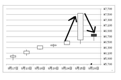 9月25日に、日東電工が日経平均株価に新規採用されました。 その25日とよく26日の動きがとてもひどい。 まず25日。載せたチャートが日足であるため、わかりにくくて恐縮なのですが、この日の上昇は、マーケットが引ける一瞬のうちに起きた上昇でした。 この…