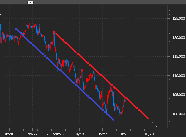 上に載せたドル円のチャートでは、下落トレンドになっているので青色のサポートラインが重要ってことですね。